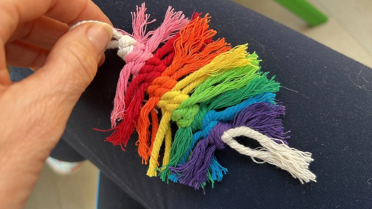 Creating special knots with string, to make a ‘rainbow string feather’, FR.
